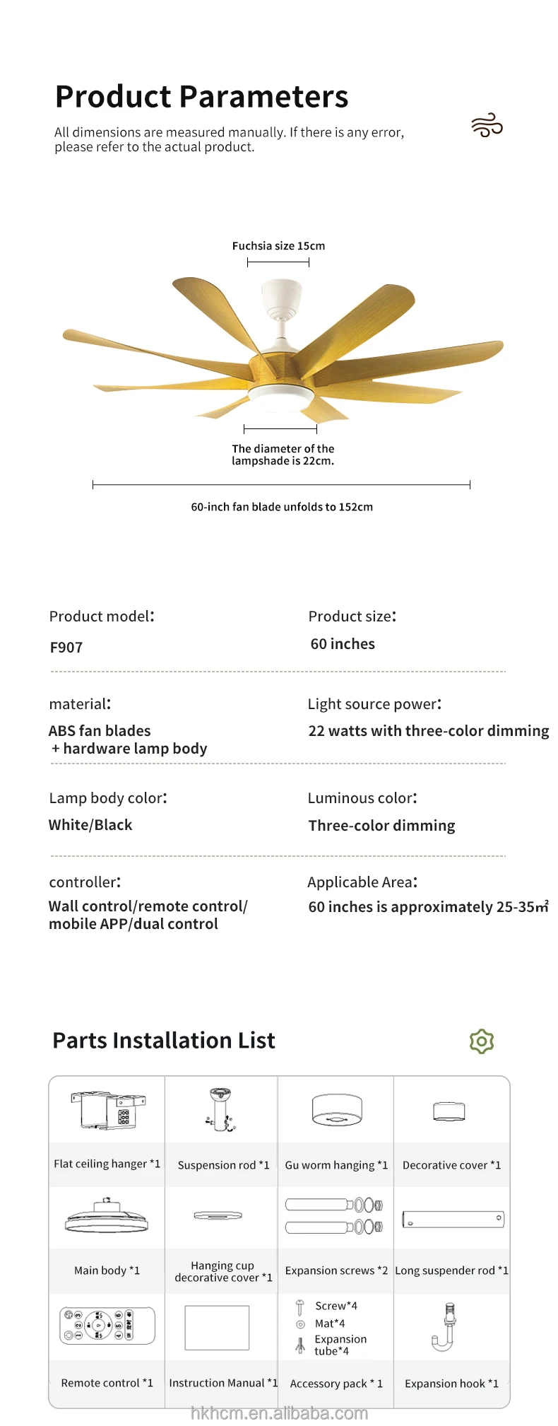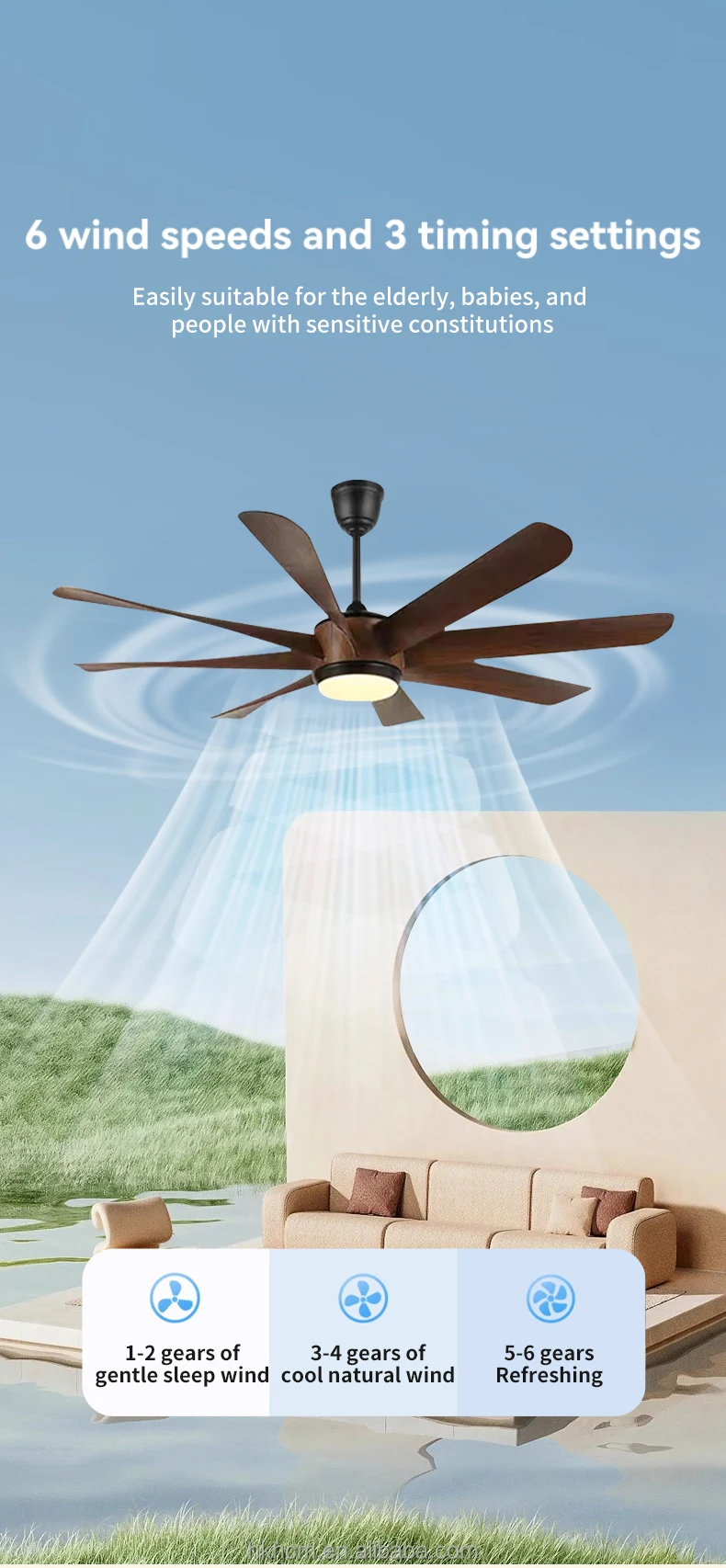 وصف المنتج المُحسّن: مروحة سقف بمحرك ألومنيوم قطر 60 بوصة مع إضاءة وريموت، محرك تيار مستمر عكسي فائق الهدوء: تشغيل هادئ للغاية (<30 ديسيبل) مع وضع الهواء النازل/الصاعد لتوفير الراحة على مدار السنة. إضاءة قابلة للتخصيص: إضاءة ليد سفلية 15 واط بثلاث درجات حرارة لونية (3000 كلفن/4000 كلفن/5000 كلفن) ووظيفة الذاكرة. تحكم ذكي عن بعد: 6 سرعات للمروحة، 3 إعدادات للإضاءة، مؤقت لمدة 1/2/4 ساعات، ووظيفة كتم الصوت للتشغيل الصامت. تدفق هواء فعّال: تصميم شفرات واسعة من الألومنيوم يوفر تهوية قوية تناسب مساحات تصل إلى 400 قدم مربع. تركيب سهل: تصميم مثبت بشكل ملاصق للأسقف المسطحة؛ مناسبة للغرف، غرف المعيشة، مناطق تناول الطعام، والباحات المغطاة. أداء موسمي مزدوج: حسّن التبريد في الصيف وعزز كفاءة التدفئة في الشتاء. أبرز المواصفات: قطر الشفرات 60 بوصة، هيكل من الألومنيوم، مناسبة للاستخدام في الأماكن الرطبة والمغطاة في الخارج، محرك معتمد من ENERGY STAR بتقنية التيار المستمر