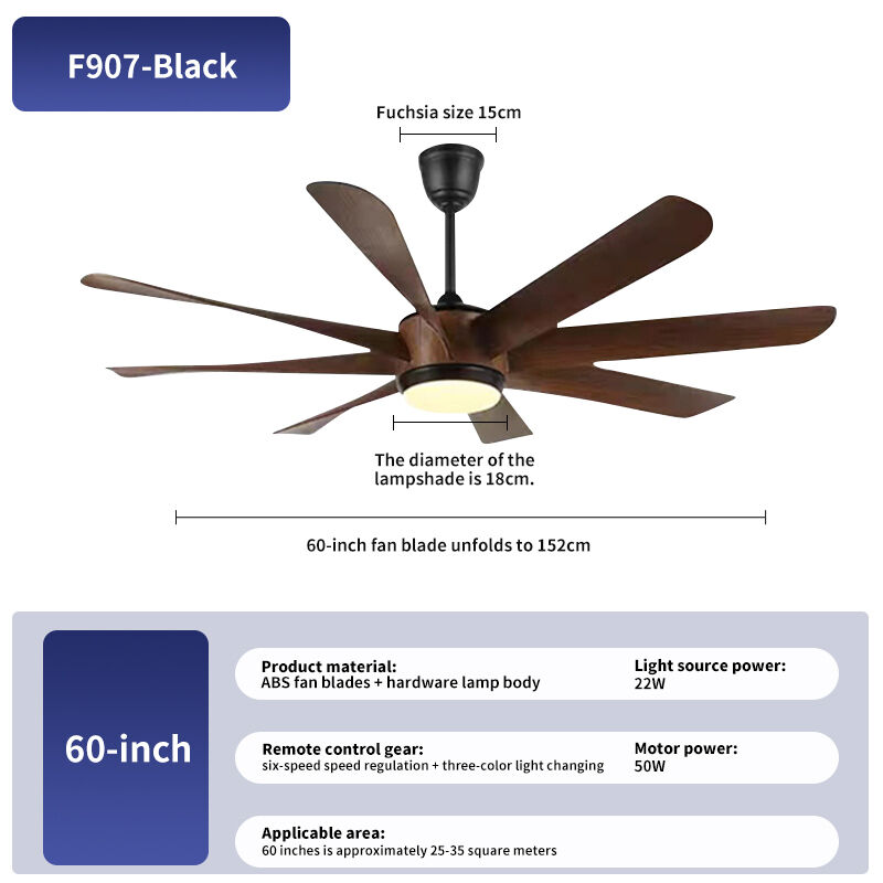 مروحة سقف سوداء بحجم 60 بوصة مع كشاف ضوئي وشفرات من مادة ABS، محرك تيار مستمر موفر للطاقة، لمبة مروحة سقف للاستخدام الداخلي