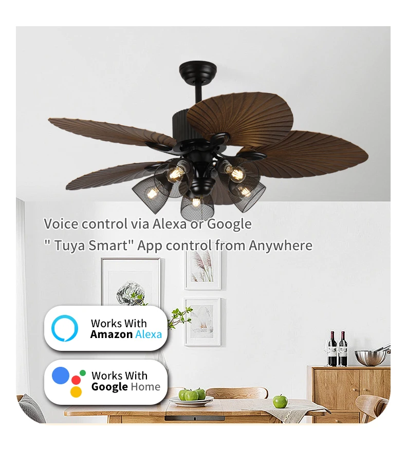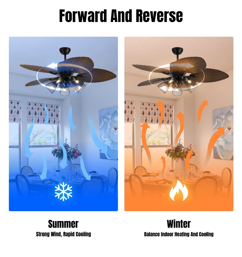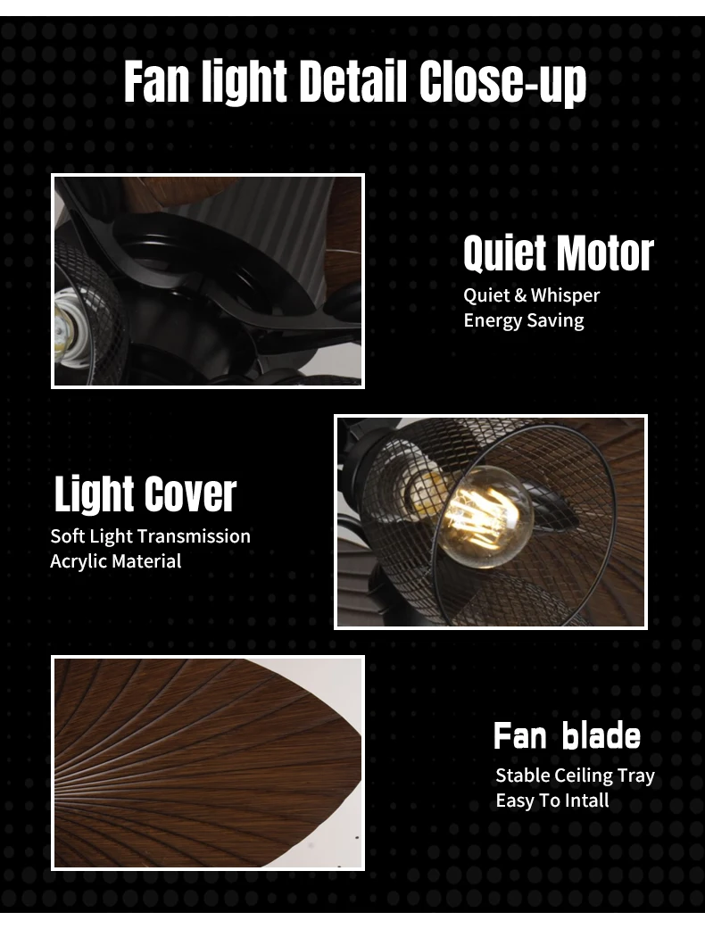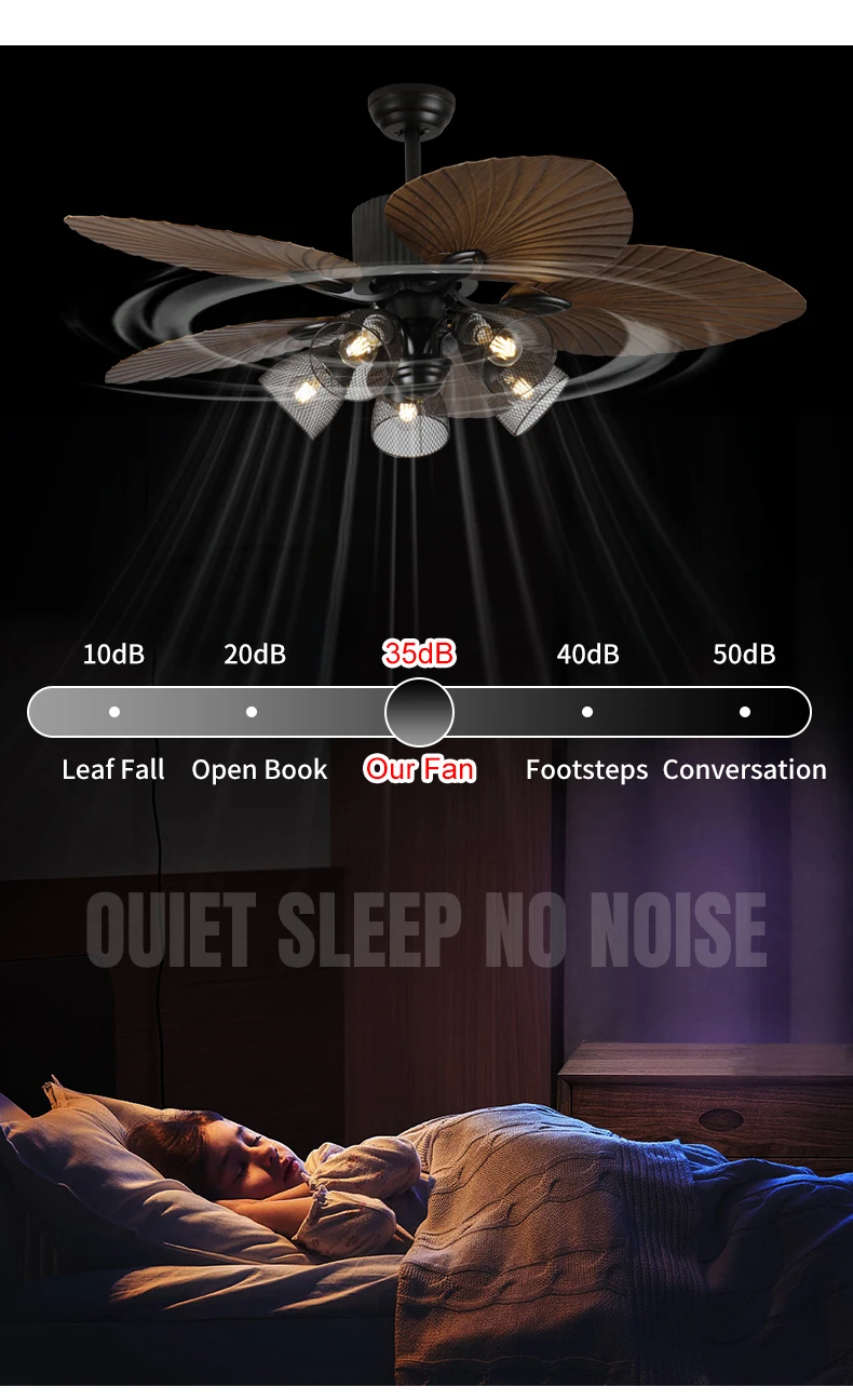 Tuotteen erotteluviimeistelyt & Muotoilukäsite Ensimmäinen asia, joka kiinnittää huomiosi, on sen ainutlaatuinen bioninen banaanilehtimuoto. Leveät ja sileät lehdet, joiden inspiroivana ovat trooppiset sademetsät, ovat kauniisti realistisen muotoiset ja myös aerodynamiikaltaan optimoidut! Mikä on tämän muotoilun keskeinen etu? Äänettömän hiljainen toiminta! Terät leikkaavat ilmavirran pehmeämmin ja luonnollisemmin, vähentäen tehokkaasti tuuliresistanssin aiheuttamaa melua ja tuomalla rauhallisen nautinnollisuuden, kuin metsän tuulenkään. Kyseessä on ensisijaisesti tehokas tuuletin! Säädettävällä tuulenvoimakkuudella voit tarvittaessa käyttää voimakasta ilmavirtaa nopeaan jäähdytykseen kuumina kesinä tai vain hellää tuulivirtaa keväisinä ja syksyisinä. Vahvalla moottorilla varustettu, pitkän matkan ilman syöttömahdollisuus, laaja kattavuusalue. Valaistus on myös erinomainen! Se sisältää laadukkaat LED-valonlähteet, jotka tuottavat pehmeän ja mukavan valon ilman ärsyttävää hehkua. Sitä varten on yleensä vaiheeton himmennystoiminto, jonka avulla voit säätää valon kirkkautta lämpimästä yövalosta kirkkaaseen lukemisvaloon tarpeidesi mukaan. Tärkeintä kuitenkin, tuuletin ja valot voidaan ohjata erikseen! Tämä tarkoittaa, että voit käynnistää vain valot, vain tuulettimen tai molemmat samanaikaisesti häiritsemättä toisiaan, jolloin eri tarpeet voidaan täyttää joustavasti.