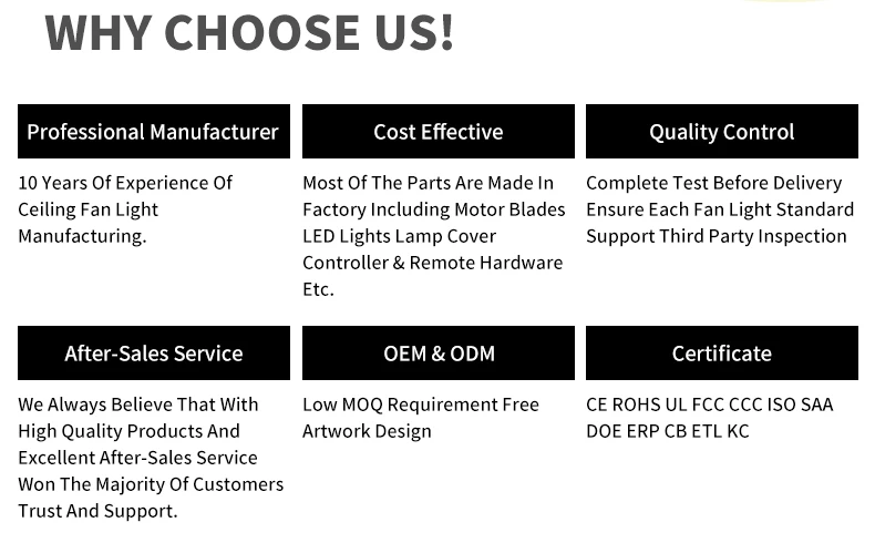 1) Specjalizacja w BHP wentylatora sufitowego 2) Posiadają sporo magazynu w USA 3) Profesjonalny personel i technologia kontroli jakości