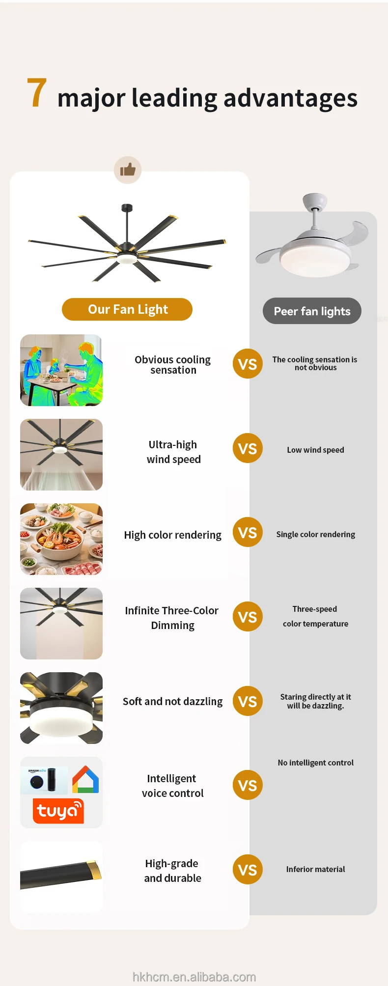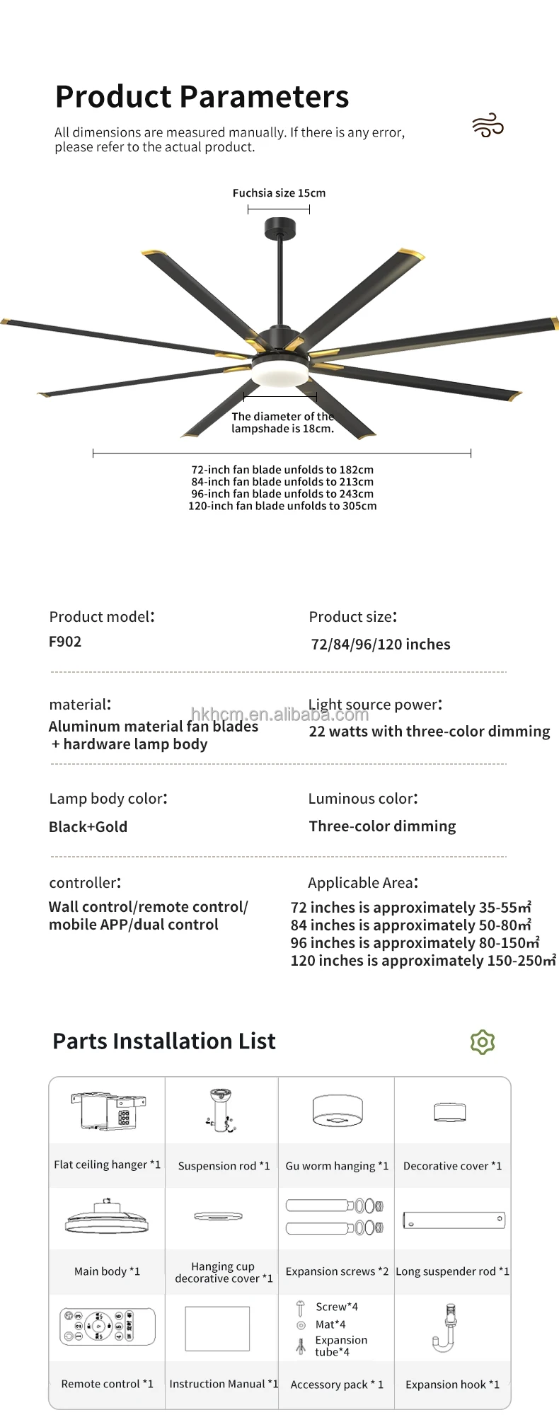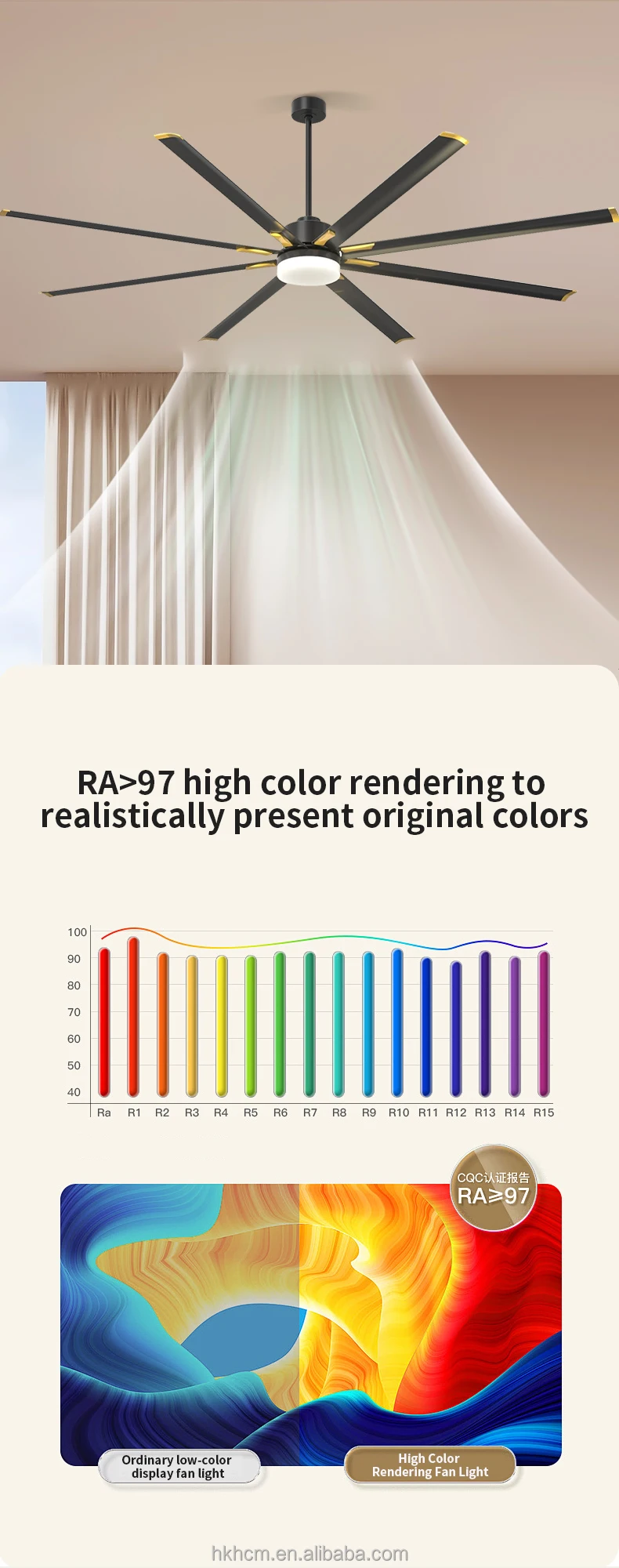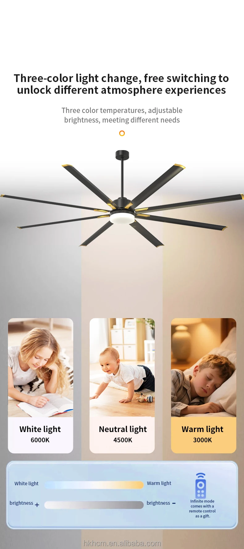 คำอธิบายผลิตภัณฑ์ที่ได้รับการปรับแต่ง: พัดลมเพดานใบพัดอลูมิเนียมขนาด 72 นิ้ว พร้อมไฟและรีโมต มอเตอร์ DC แบบกลับทิศได้ เงียบสุดๆ การทำงานที่ไร้เสียงรบกวน (<30dB) พร้อมโหมดดูดอากาศลงและดูดอากาศขึ้น เพื่อความสบายตลอดทั้งปี การให้แสงสว่างที่ปรับแต่งได้: ไฟดาวน์ไลท์ LED 15 วัตต์ พร้อมอุณหภูมิสี 3 ระดับ (3000K/4000K/5000K) และฟังก์ชันจดจำค่าล่วงหน้า รีโมตคอนโทรลอัจฉริยะ: 6 ระดับความเร็วของพัดลม, 3 โหมดแสงไฟ, ตั้งเวลาปิดอัตโนมัติ 1/2/4 ชั่วโมง และฟังก์ชันปิดเสียงรีโมตเพื่อการใช้งานอย่างเงียบเชียบ การไหลเวียนของอากาศที่มีประสิทธิภาพ: ออกแบบใบพัดกว้างจากอลูมิเนียม สร้างแรงลมทรงพลัง เหมาะสำหรับพื้นที่ไม่เกิน 400 ตร.ฟุต ติดตั้งง่าย: ดีไซน์ติดตั้งแนบเพดานเหมาะกับเพดานเรียบ เหมาะสำหรับห้องนอน ห้องนั่งเล่น ห้องอาหาร และลานกลางแจ้งที่มีหลังคาคลุม ประสิทธิภาพการใช้งานสองฤดูกาล: เพิ่มประสิทธิภาพการระบายความเย็นในฤดูร้อน และช่วยกระจายความร้อนได้อย่างมีประสิทธิภาพในฤดูหนาว จุดเด่นของข้อมูลจำเพาะ: ขนาดเส้นผ่านศูนย์กลางใบพัด 72 นิ้ว โครงสร้างทำจากอลูมิเนียม ใช้งานได้กับพื้นที่เปียก (Wet-rated) เหมาะสำหรับการใช้งานกลางแจ้งที่มีหลังคาคลุม มอเตอร์ DC ได้รับการรับรองมาตรฐาน ENERGY STAR