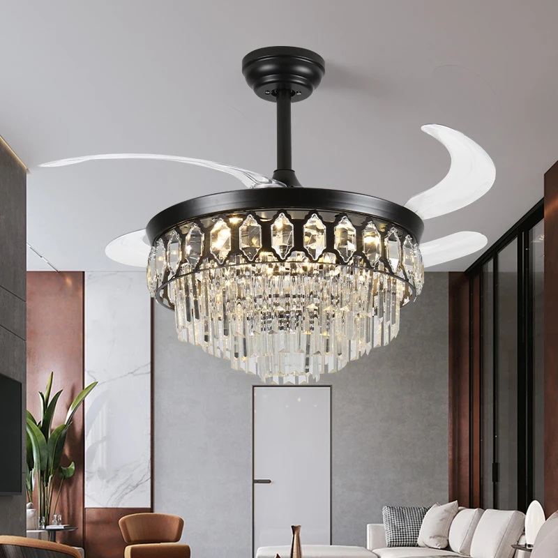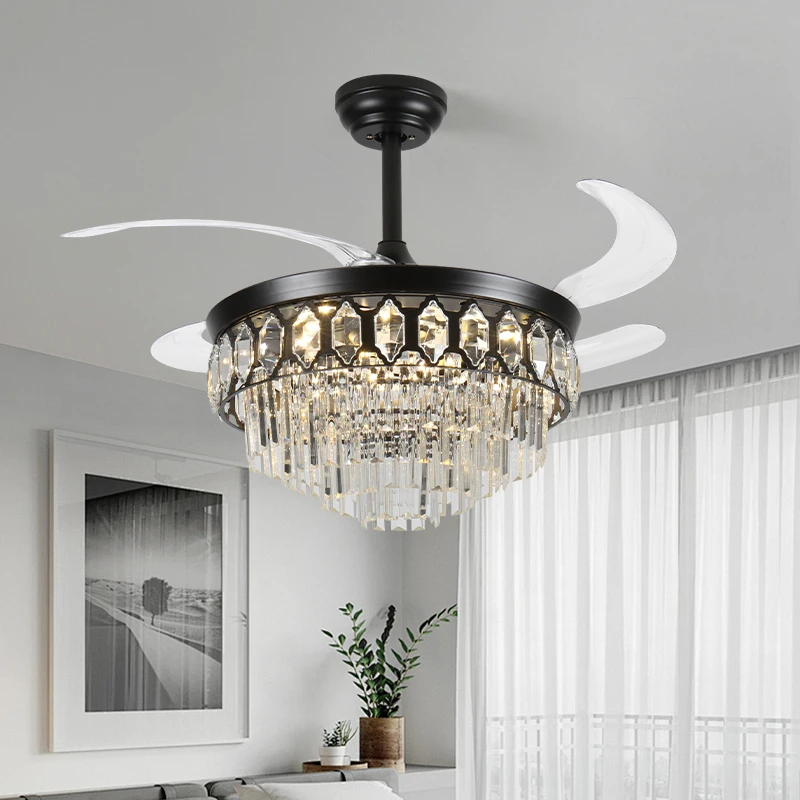 Thiết kế Chandelier Pha lê Tinh tế – Quạt trần thu gọn 42" với đèn có đặc điểm nổi bật là một chiếc chandelier pha lê đẹp mắt, vừa hoạt động như một chiếc quạt chức năng, vừa là một thiết bị chiếu sáng tinh tế. Các cánh quạt trong suốt sẽ tự động thu gọn khi không sử dụng, mang lại nét thanh lịch cho phòng ngủ, phòng khách, phòng ăn của bạn, v.v.
