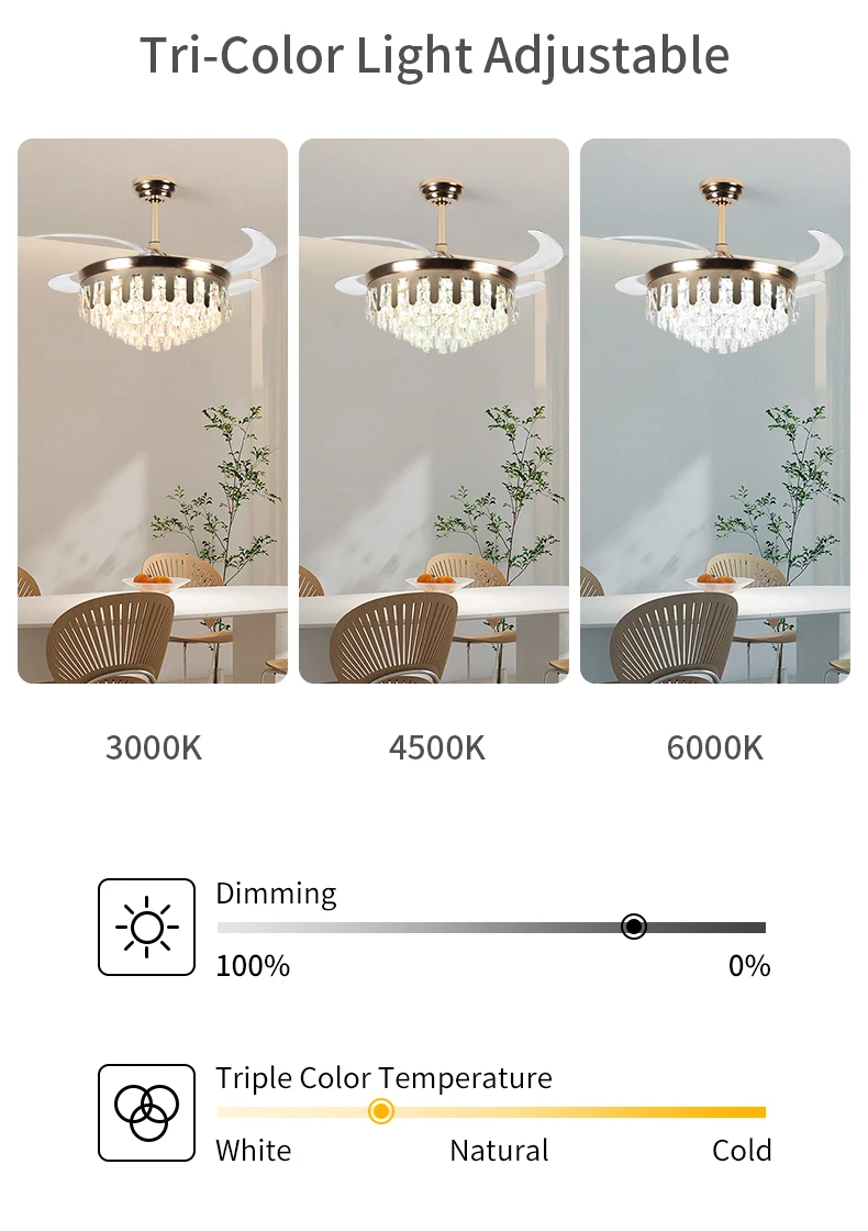 - Quạt trần hiện đại có thể thu gọn với đèn - 42" 48 "đèn chùm kết hợp quạt trần tích hợp chức năng của quạt trần với sự sang trọng của đèn chùm pha lê. Quạt và đèn có thể điều khiển độc lập, và cánh quạt sẽ tự động thu gọn khi bạn tắt quạt, để lại một chiếc đèn chùm vàng óng ánh đường kính 18", mang đến vẻ đẹp sang trọng một cách tinh tế cho bất kỳ không gian nào